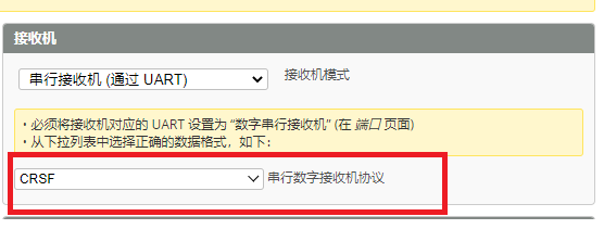 3.在软件的接收机配置选项页面的左上“接收机”中的接收机模式下拉框选择串行接收(通过UART),在“串行数字接收机协议”下拉框中选择CRSF。