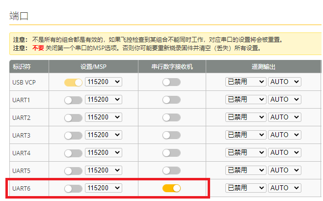 2.将飞控连接到PC,打开Betaflight Configurator并连接。打开端口配置页面,开启UART6的串行数字接收