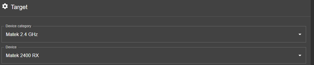 8.选择硬件硬件信息,Device category下拉框中选择 Matek 2.4GHz;Device下拉框中选择选择Matek 2400 RX。注意如果是ExpressLRS-3.x.x版本,Device下拉框选择型号是Matek 2400 RX R24D。