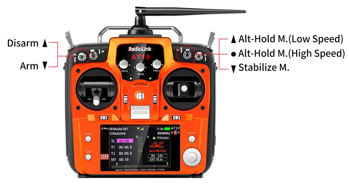 There are three flight modes for F121 including Altitude Mode- Low Speed, Altitude Mode- High Speed and Stabilize Mode. The flight modes can be switched by pressing the three-way switch on T8FB- SWB or T8S- CH5, and T8FB- SWA or T8S- CH7 is used to arm/disarm the aircraft, as shown below: