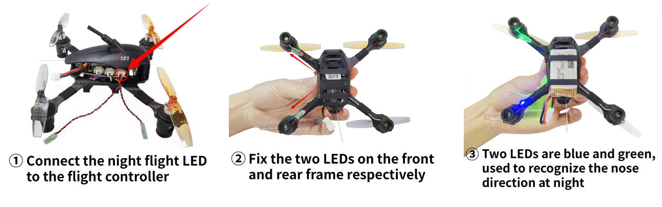 F121 comes with direction LED in green and blue for night flight. When flying at night or in a dark room, it can help to indicate the aircraft nose. Please follow the below steps to install and use it.
