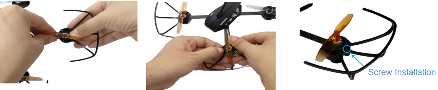 Propellers installation can be skipped as the whole F121 is already assembled by factory default. If the default propellers get worn and needs to be replaced after a period of flight, it is important to well identify the rotation direction of propellers. If installed incorrectly, F121 can’t take off even the throttle is pushed to max.