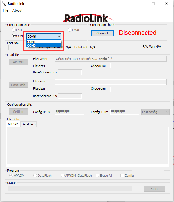 After T8S/T8FB is connected with the firmware upgrade software successfully, click the “APROM” button to select the correct firmware.