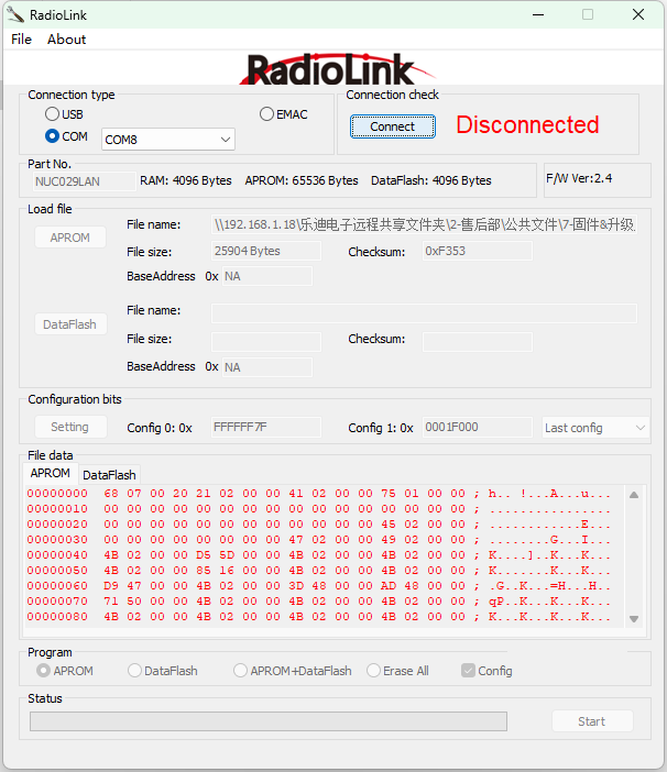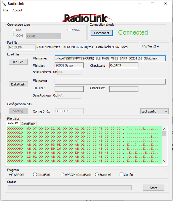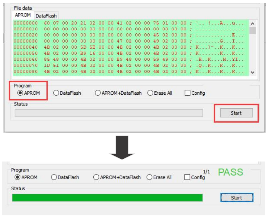 After selecting the correct firmware, make sure that “APROM” is selected in the “Program”, and then click “Start”.