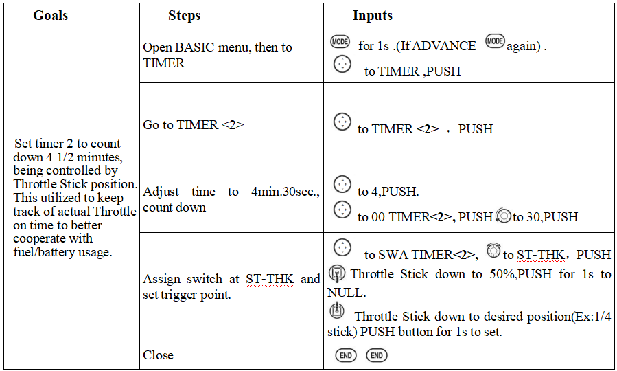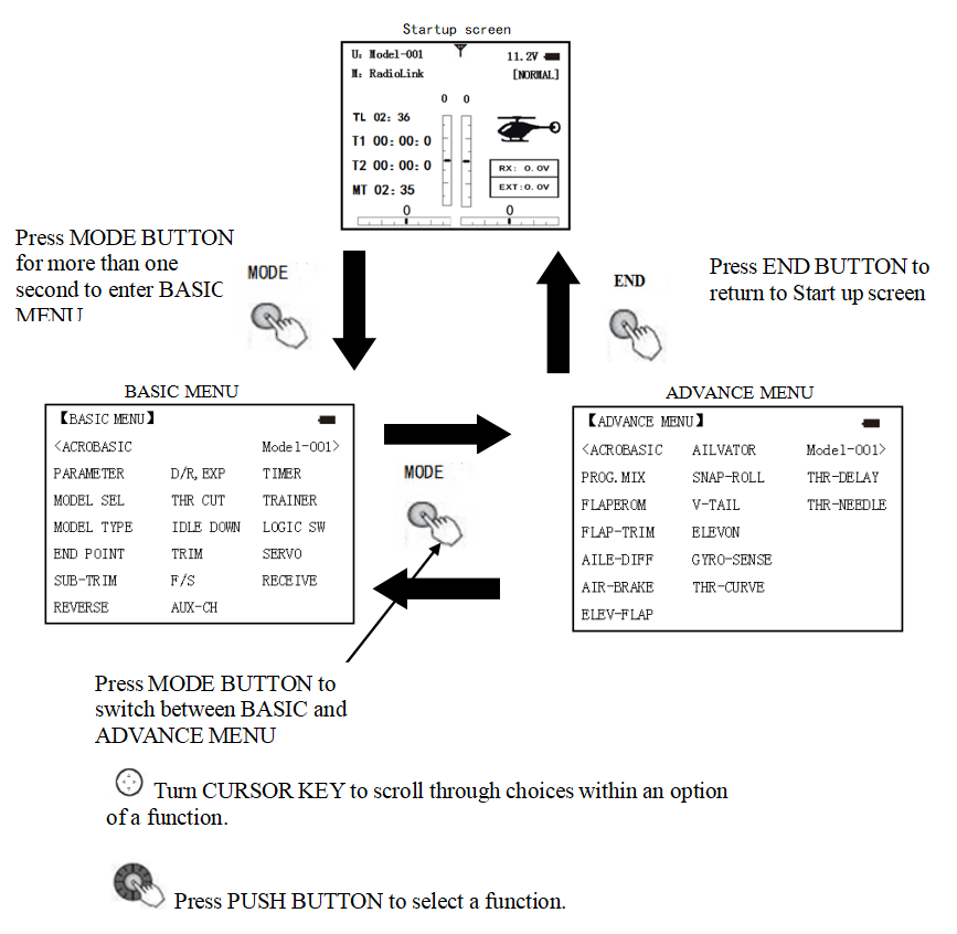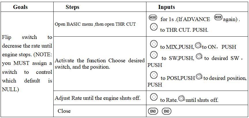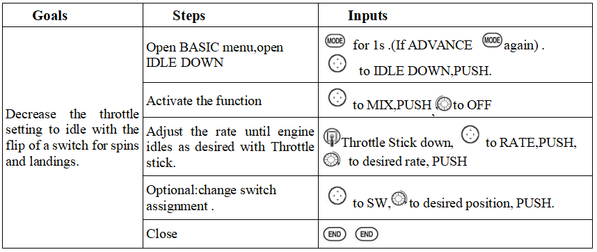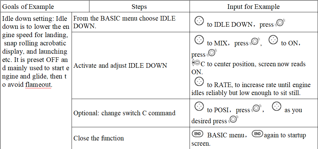 •IDLE- DOWN (ACRO), THR-CUT (ACRO HELI) (engine shut off), and MOTOR CUT (GLID) setups to allow precise engine/motor control for taxi and landings.