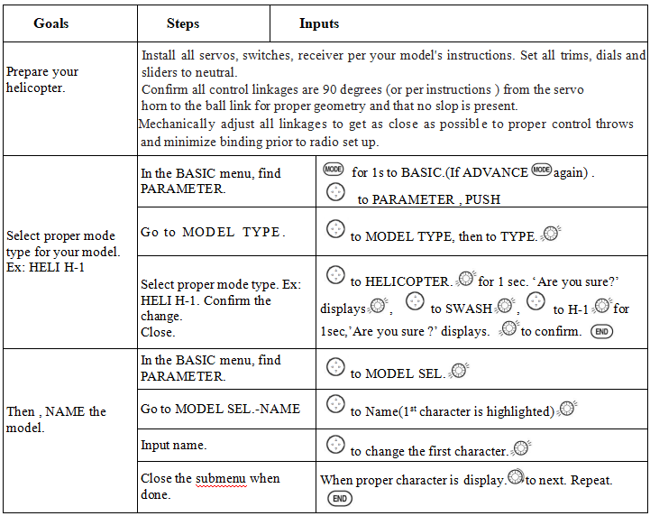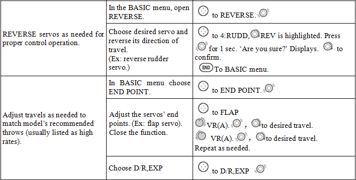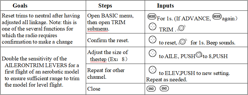 The necessary elevator offset varies with model geometry, so it must be determined by noting collective pitch changes at high speed. The rudder offset is affected by both revo. mixing and trim lever movement while in the offset function.