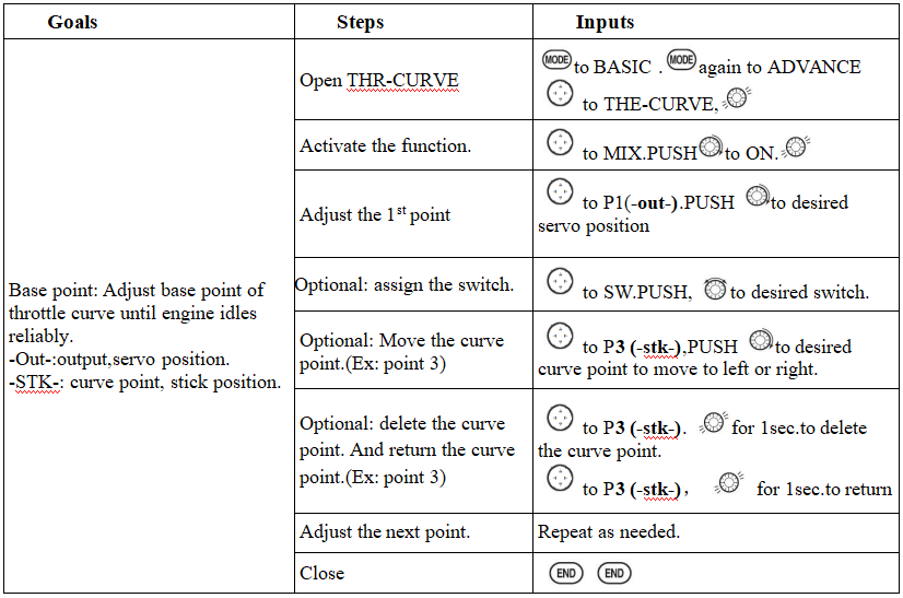 • THR-CURV/NOR: Inputs the normal (NORM) throttle curve, which is usually not a linear response to THROTTLE STICK motion. Adjusting point 4 of the curve adjusts the engine's RPM at the THROTTLE STICK midpoint, the desired position for hovering. The other 6 points are then adjusted to create the desired idle and maximum engine speed, and a smooth transition in-between.