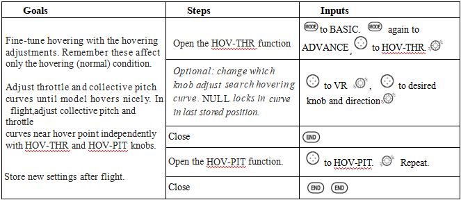 Hovering throttle and hovering pitch are fine-turning adjustments for the throttle and collective pitch curves individually, affecting performance only around the center point and only in the normal condition. They allow in-flight tweaking of the curves for ideal setup.