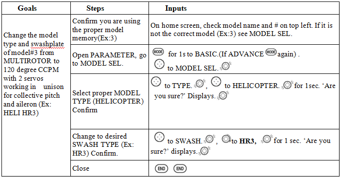 Switch/Knob A or H | Airplane (ACRO) | Sailplane/Glider (GLID) | Helicopter (HELI) | MULTIROTOR |
