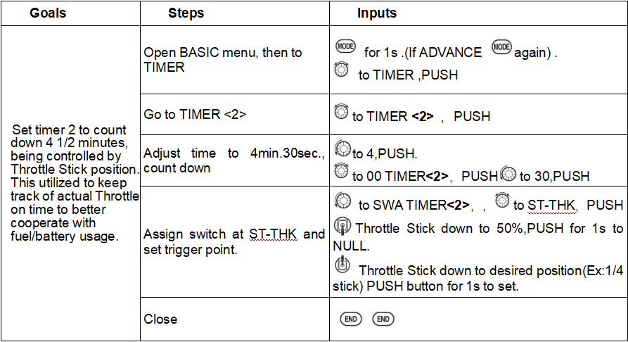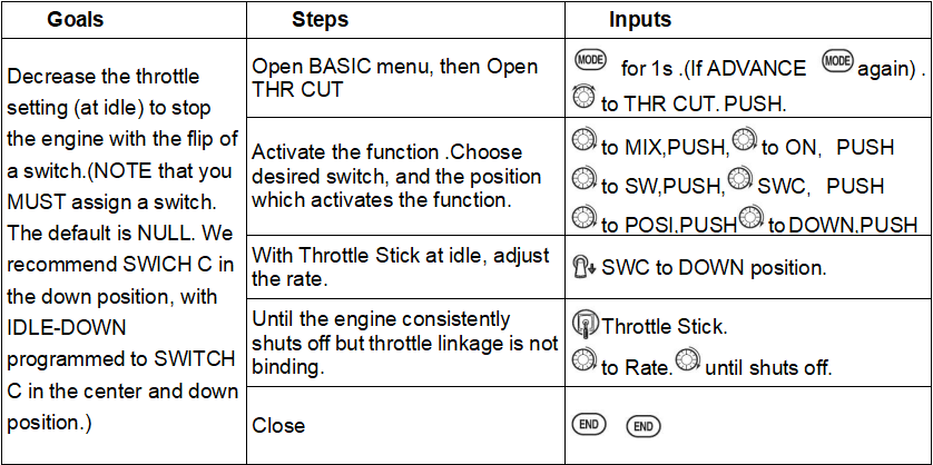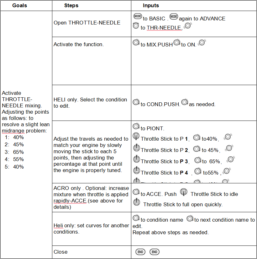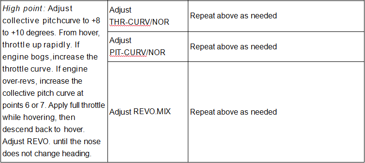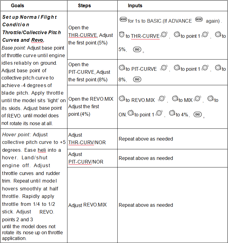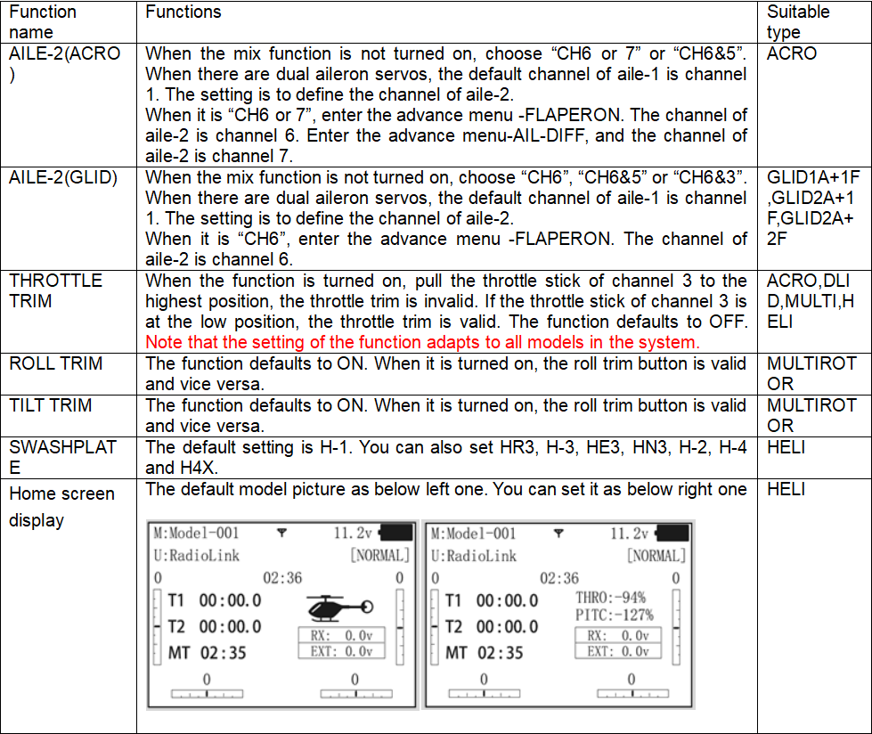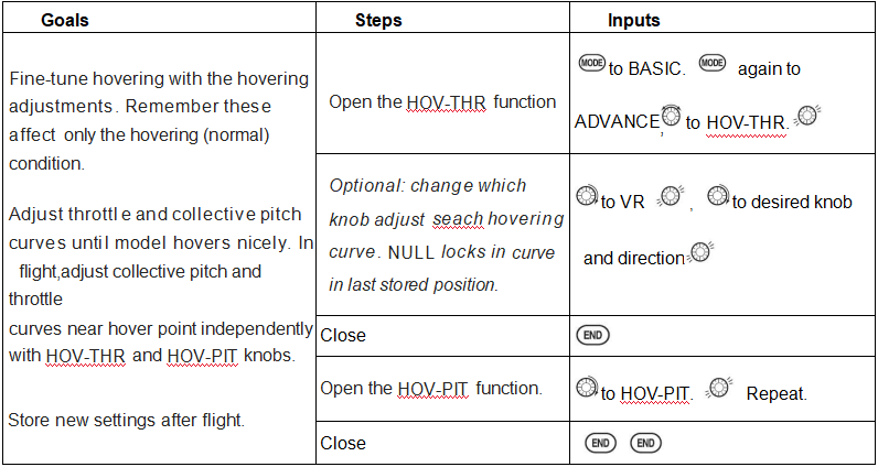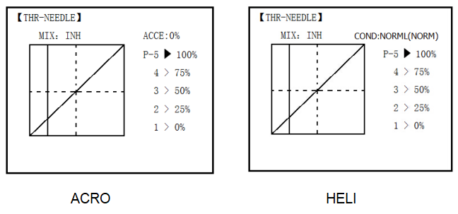 The setting of THROTTLE NEEDLE of helicopter is the same with that of acrobasic. Click here or go to page 54 to check the detailed setting method.