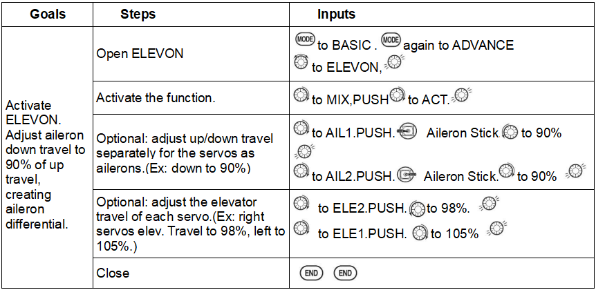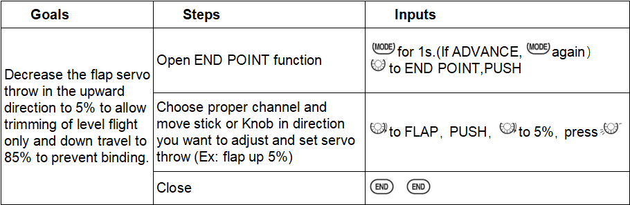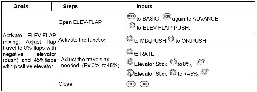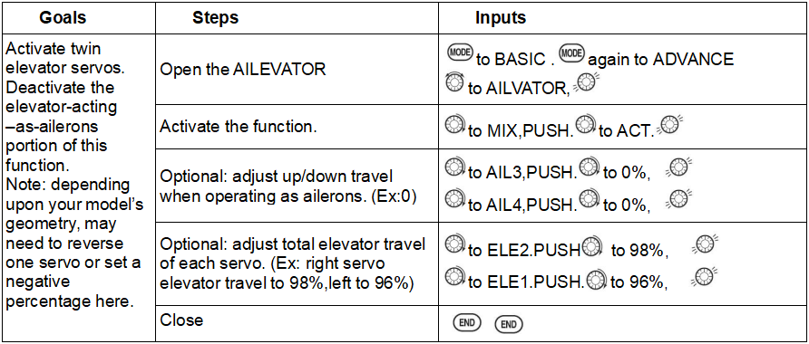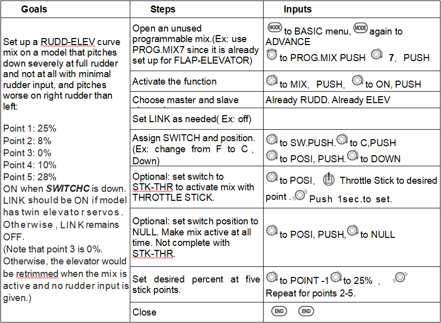 The necessary elevator offset varies with model geometry, so it must be determined by noting collective pitch changes at high speed. The rudder offset is affected by both revo. mixing and trim lever movement while in the offset function.