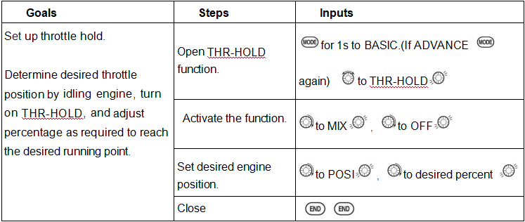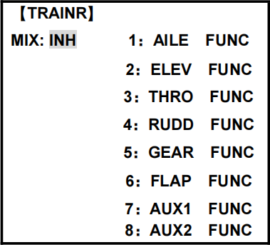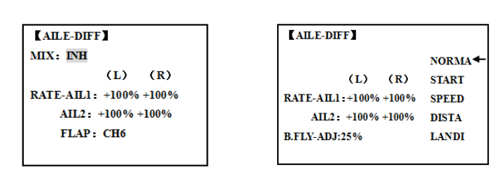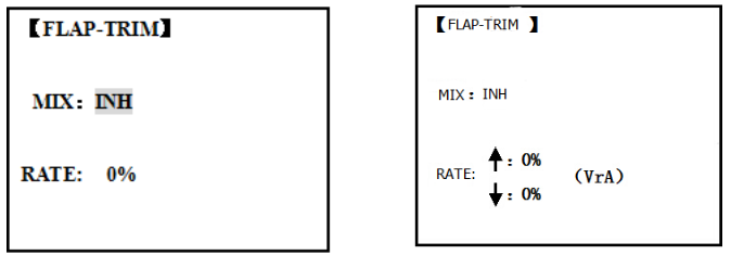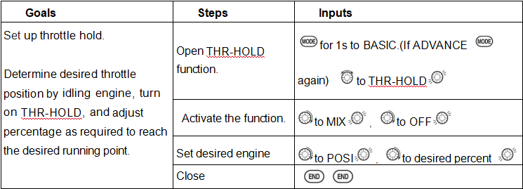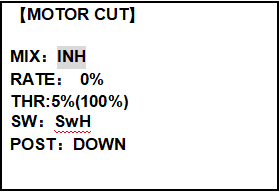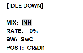 This function holds the engine in the idling position and disengages it from the THROTTLE STICK. Once the function is turned on, the throttle stick won’t respond to any movement. If the rate of throttle hold is low, there is risk of crash for airplanes. Set MIX to INH or On. SWA to SWH can be set as switch to control the function. There are two modes, including RATE and THROTTLE.