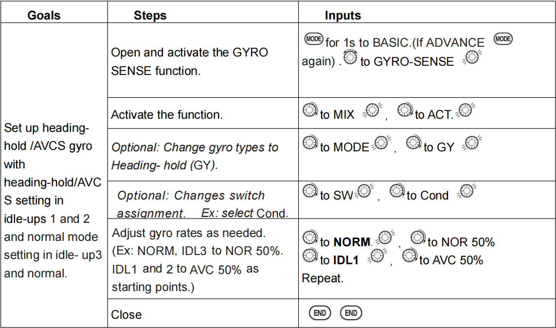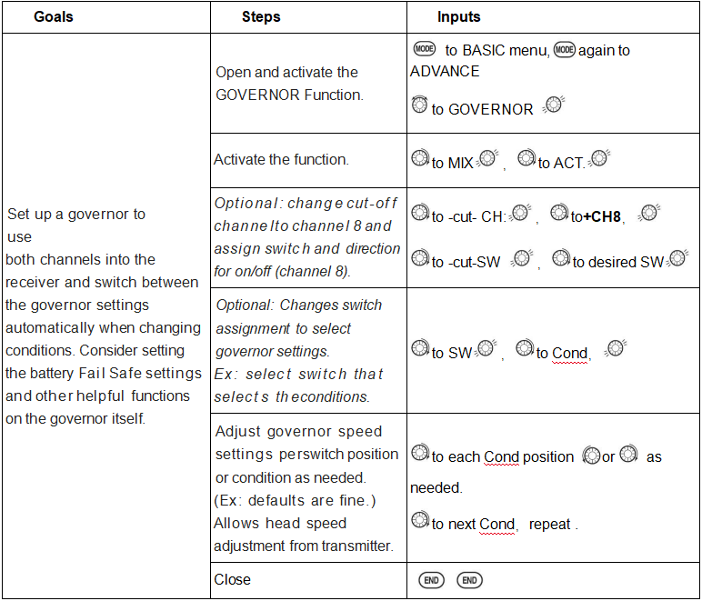• Governor settings may be set up to follow Normal/Idle1/Idle2, but do not offer a setting to adjust for each of the 5 conditions like gyro.