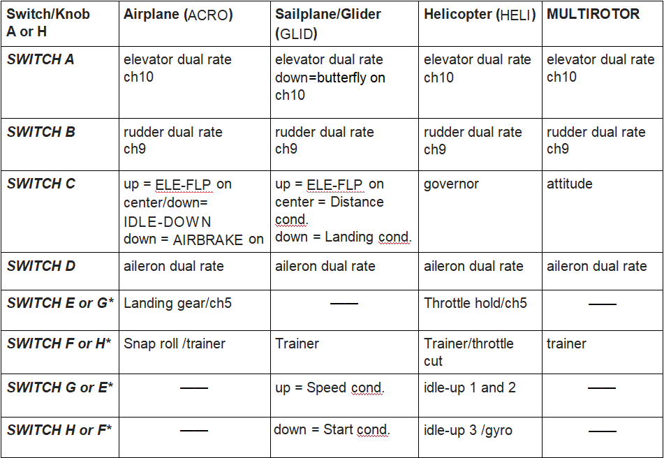 • The factory default functions activated by the switches and knobs for a AT9S Pro transmitter are shown below.