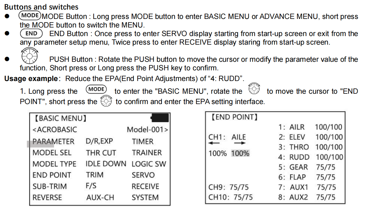 The BASIC menu is suitable for all type models, including airplane, helicopter, glider, MULTIROTOR, cars and boats. Please go to PART 3 for advance menu.