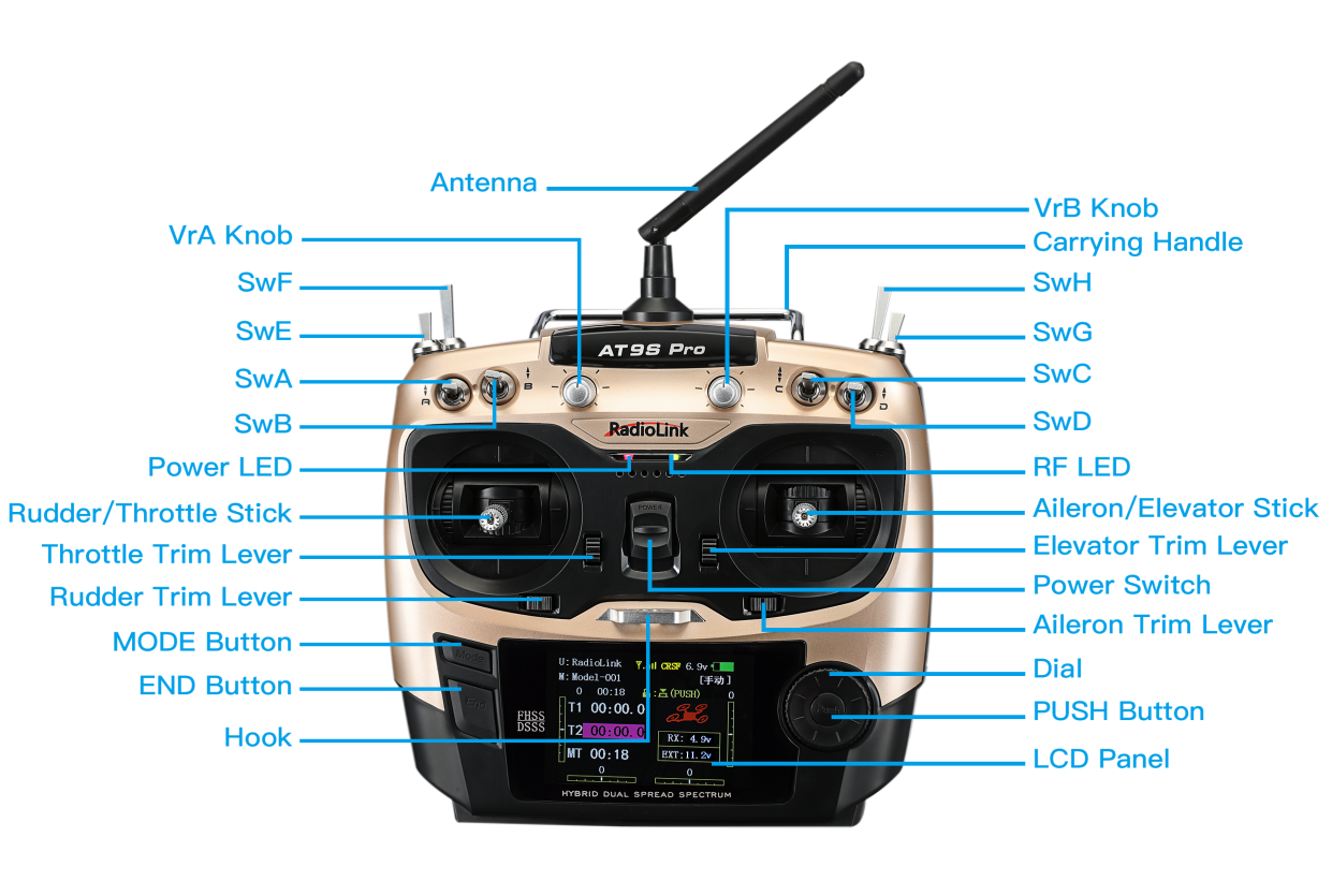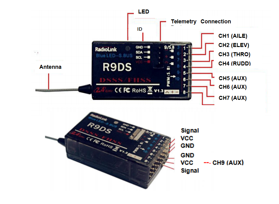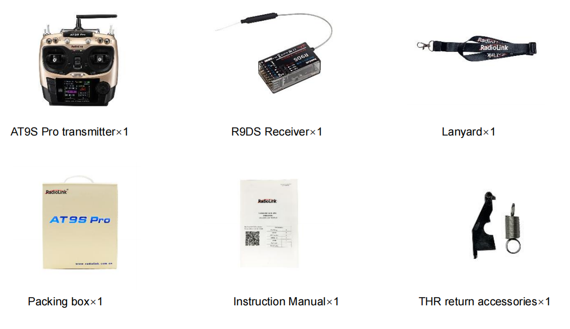 Besides R9DS, AT9S Pro is also compatible with Radiolink R6DS, R10DS, R12DS and super mini 10 channels receiver R6DSM and 12 channels mini dual antenna receiver R12DSM.