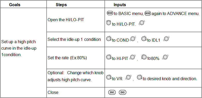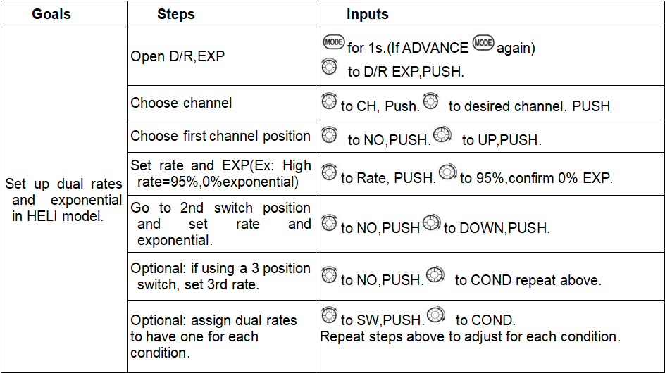 Additional flight conditions are available specifically for helicopters. These additional flight conditions contain different throttle curves, collective pitch curves, revo. mixing, and trims (except IDLE-3) to make the helicopter perform certain maneuvers more easily. Lastly, the gyro and dual rate functions may be set to provide separate rates per condition selected, including one for each idle-up.
