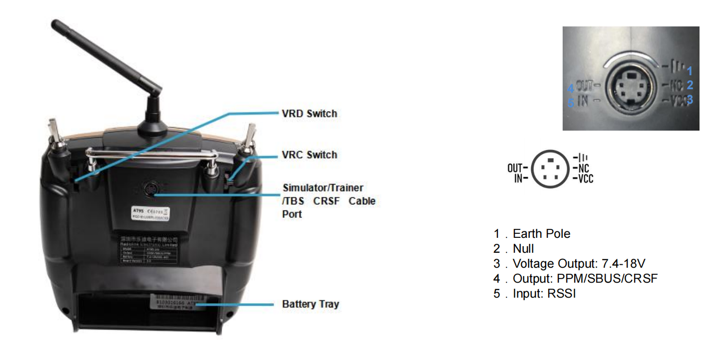 2、Connect TBS crossfire transmitter with the CRSF cable to the simulator port at the back of AT9S Pro.