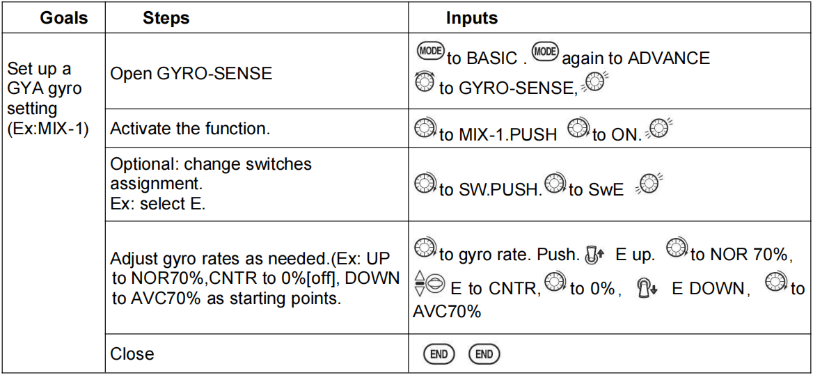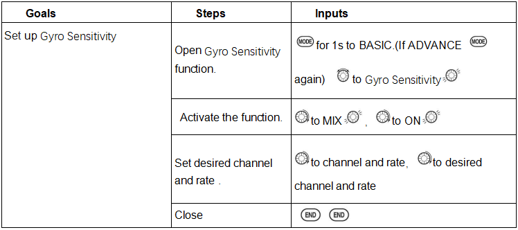 When MIX set OFF, gyro is disabled while when MIX set ON, you can adjust gyro sensitivity. The channel can be set from channel 5 to channel 10. After setting the channel of GYRO, connect the channel with receiver.