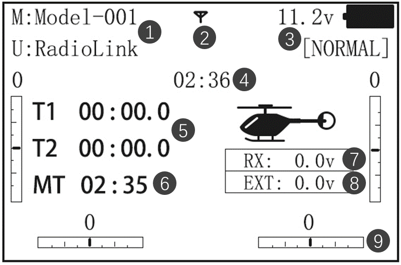 Take model 2 left hand as an example. There are 4 calibrated scale on the screen edges, which represents the trimming of aileron, elevator, throttle and rudder, corresponding to four trimmer button on the transmitter. Do not use trimmer button before first flight. It is suitable to trim flight attitude during first horizon flight.