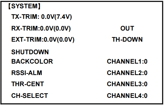 RX-ALARM: The minimum voltage alarm of receiver. It can be self-set. When it is below the minimum voltage, the transmitter will vibrate and sound the alarm.