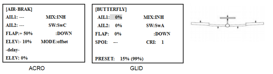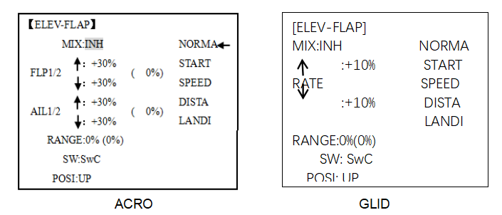Stick Mode: The screen reads "STK-MODE". Change this to the correct mode. Note that this will NOT change the throttle and elevator ratchets, etc. Those are mechanical changes that must be done by a service center.