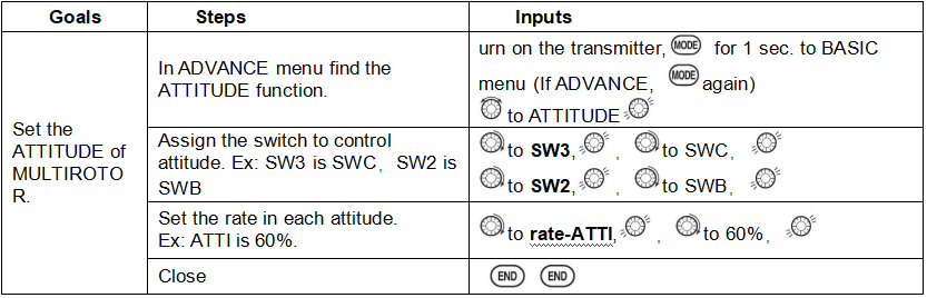 The setting of Attitude of multirotor is the same with that of acrobasic. Click here or go to page 56 to check the detailed setting method.