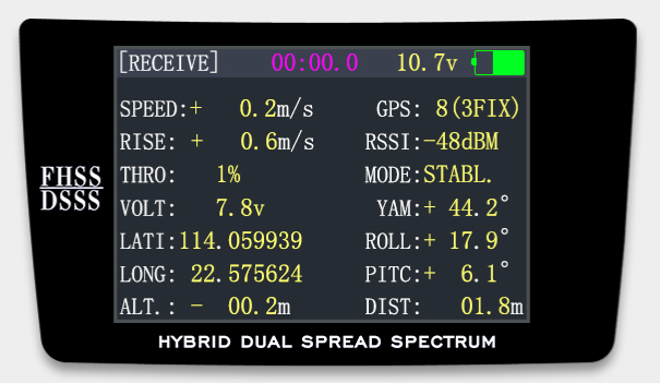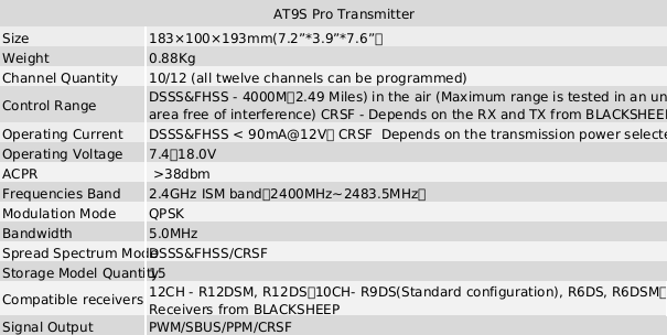 AT9S Pro is a 10 channels transmitter, support 2.4G DSSS and FHSS dual hybrid spread spectrum, 16 channels pseudo random frequency hopping.