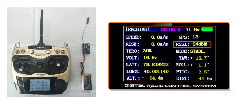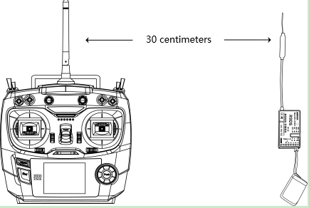Before flight, always remember to do the RSSI testing to avoid the possible unexpected signal loss. Power on transmitter and receiver, keep them with the distance of about 30 centimeters and both antennas straight.