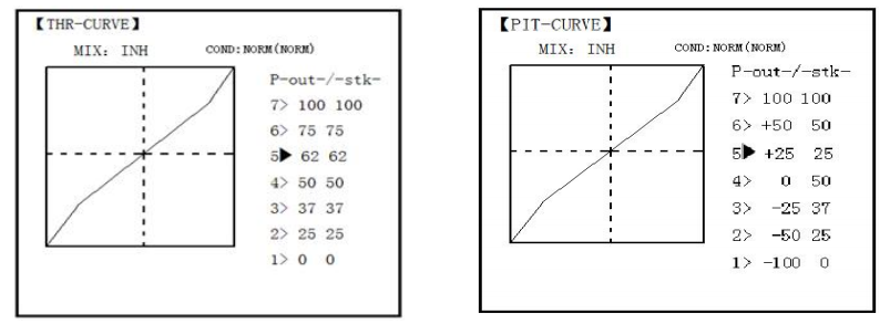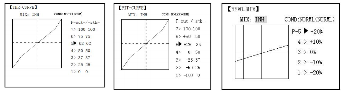 • Curves are adjusted to maintain constant RPM even when the collective pitch is negative (inverted). Note that REVO mixing has one curve for idle-ups 1 and 2 and a second curve just for idle-up3.