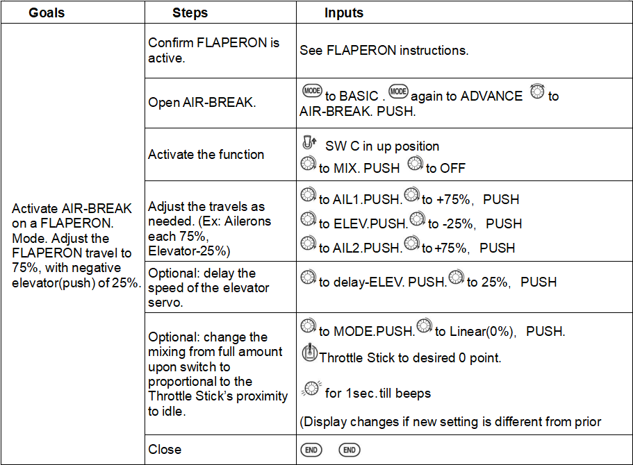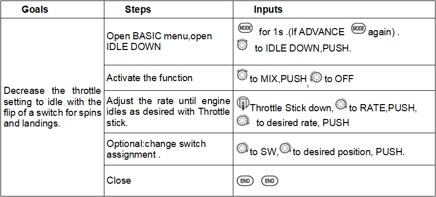 Additional idle-ups may be used to maximize the helicopter's flight characteristics in certain types of flight (i.e. fast forward motion, backward) or maneuvers (loops, rolls, stall turns), or even the same maneuver but changing from heading-hold/AVCS gyro mode to normal gyro mode. The AT9 provides 3 idle-ups to allow the modeler 3 additional setups along with the normal flight condition. (Note that IDL3 does not include governor settings.)