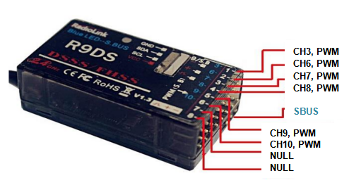 (2) SBUS&PWM dual signal output working mode: blue/purple LED indicates SBUS&PWM signal output at the same time with 10 channels totally. CH9 outputs SBUS signal while the original CH1 outputs CH3 PWM signal and original CH2 to CH6 output CH6 to CH10 PWM signal at the same time.