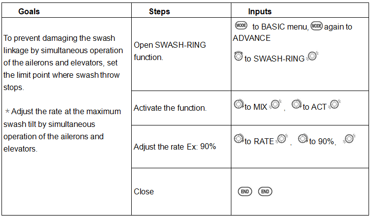 This function is to limit movement of swash plate to avoid damage to the SWASH ROB during operation aileron and ELEVATOR. It is affected in 3D flight. Movement of AILERON and ELEV is limited in the circle.