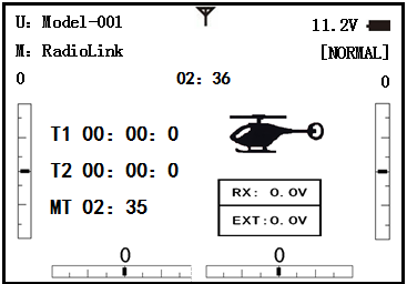 After successful connection between the transmitter and the receiver, RX will shows the voltage of the receiver.(When using receiver R6DS, R6DSM and R12DSM, RX will not be displayed )