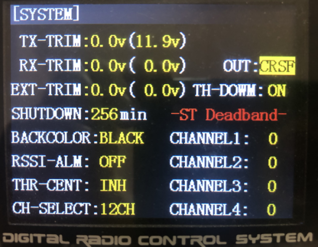 1、Power on the transmitter- Long press the Mode key to enter the BASIC MENU->Rotate the Scroll Dial to highlight the SYSTEM option and depress the Enter key->Select the OUT and change the output as CRSF