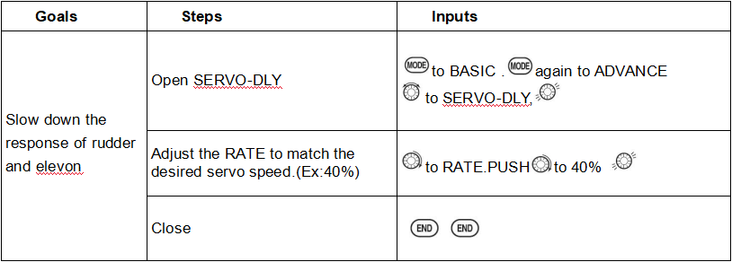 The setting of SERVO-DLY of helicopter is the same with that of acrobasic. Click here or go to page 56 to check the detailed setting method.