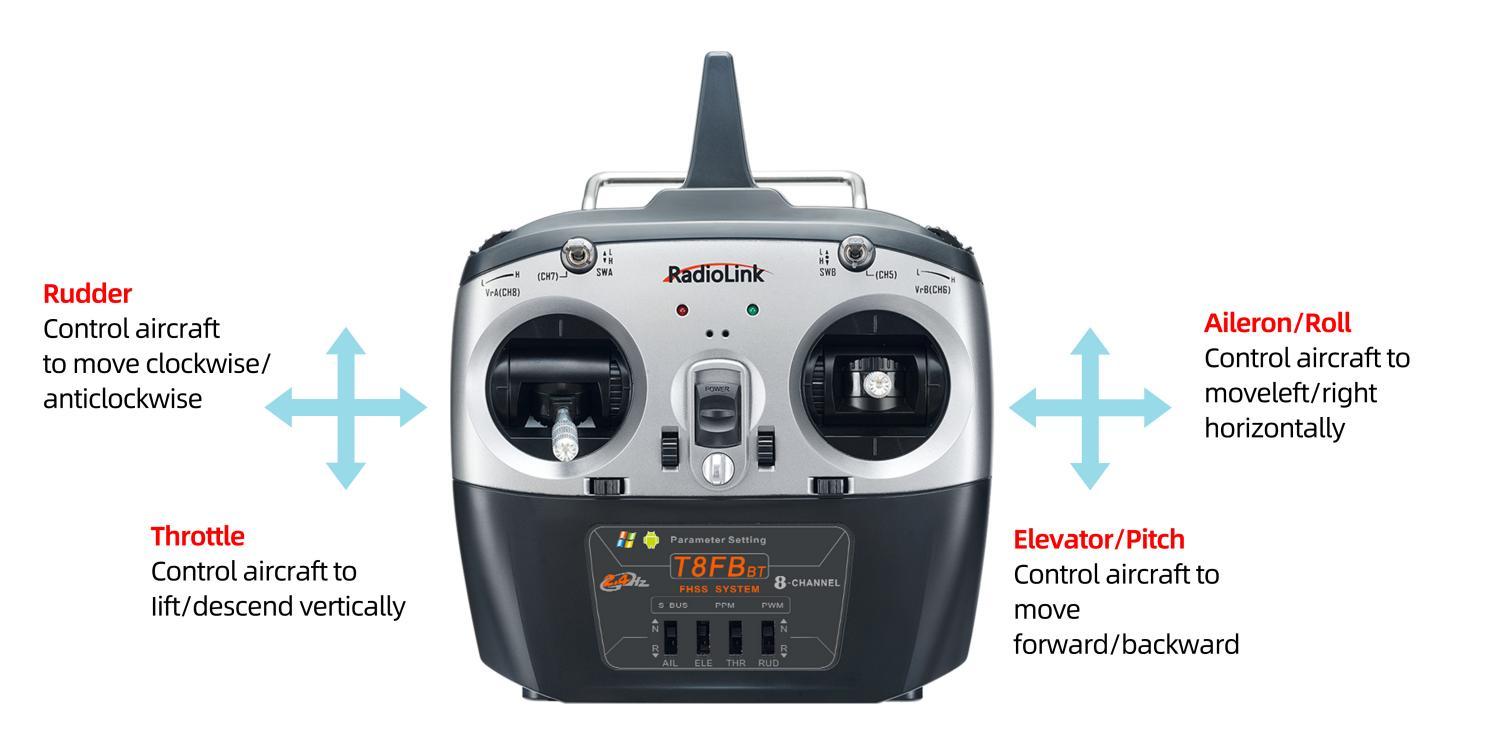 These four basic channels are operated by the two sticks on the transmitter. Most transmitters have not only these 4 channels but also other auxiliary channels such as switches for changing fight modes, controlling PTZ and camera. These commands will be passed to the receiver on aircraft via wireless signal by the emission system of transmitter. So we usually name the channels besides 4 basic ones auxiliary channels.