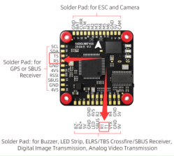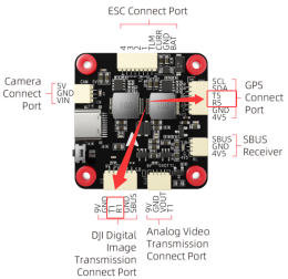Connection instructions: Connect the left end of the PRM-03 to the receiver, and the right end to F405 flight controller. Connect the TX and RX pins on the right side of the PRM-03 to any RX and TX pins on F405 (see the diagram below). Connect the 5V and GND pins to any 5V and GND pins on F405.