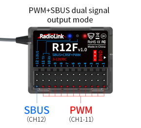 CH1 to CH11 output PWM signal output while CH12 outputs SBUS signal.