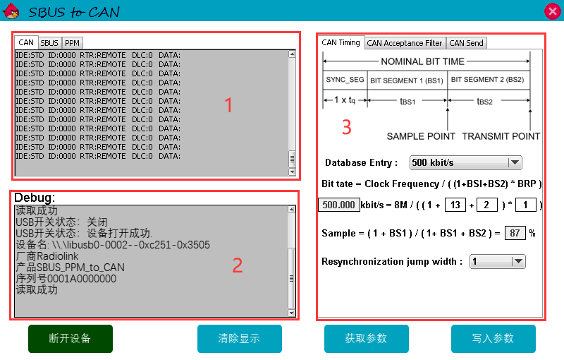 数据接收功能2. 数据接收显示功能3. 数据清除功能4. 滤波功能5. 高级屏蔽功能6. 数据发送功能7. SBUS、PPM信号转CAN信号