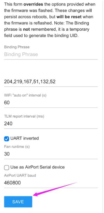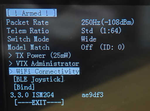 A: It is normal that the screen goes black at this time. WiFi Connectivity allows the mobile phone to connect to the WiFi of ELRS module or ELRS receiver and modify the parameters. After clicking the WiFi Connectivity option, check the WiFi on your mobile phone and you can see "ExpressLRS TX" or "ExpressLRS RX" . Connect it and your phone will automatically jump to the browser interface (If it does not jump automatically, click the WiFi manually, and then enter the password expresslrs to connect it). After modifying the parameters, click Save. Exit the script on the transmitter, and the screen will return to normal.