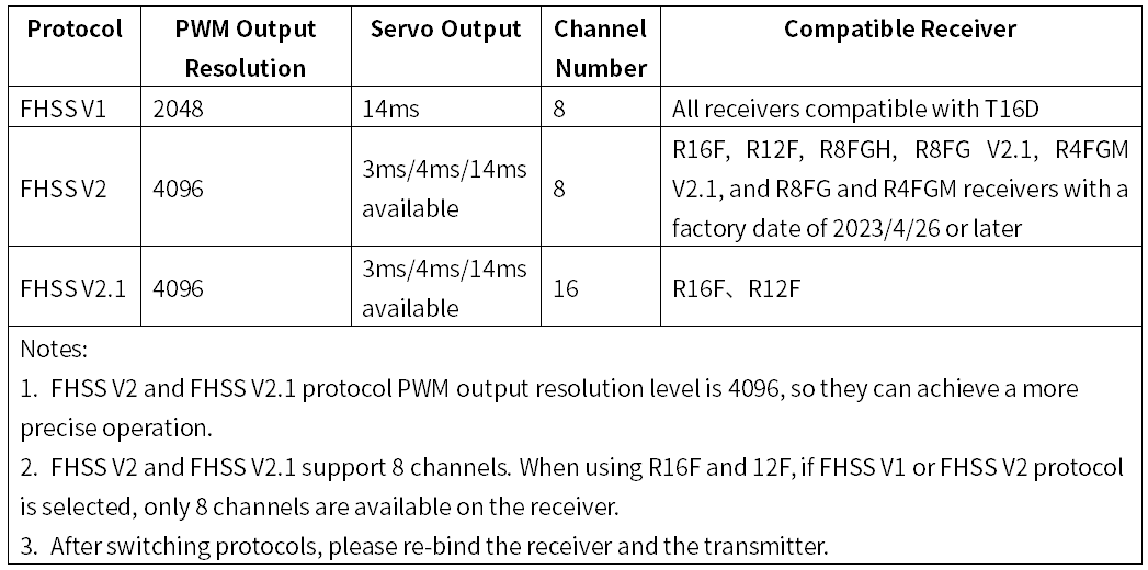 For details of channel number , receiver protocol and compatible receivers, please refer to table below: