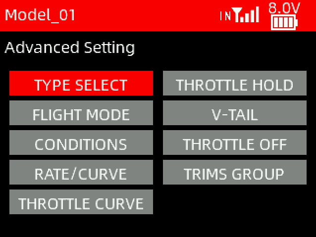 SERVO SPEED: Servo response speed. 14ms, 4ms, 3ms can be selected. 14ms is the response speed of the analog servo. 4ms and 3ms are the response speeds of the digital servo. If you are using a digital servo, you can select a servo speed of 4ms or 3ms. Please confirm whether the receiver you are using supports digital servo.