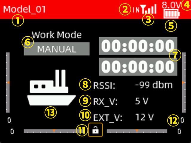 ① The name of the current model. You can select different models in Transmitter Settings - MODEL interface. T16D can support up to 100 sets of model storage. Before operating the model, be sure to check whether the model on the screen is consistent with the actual model used. If you select the wrong model, the movement, direction and neutral position settings of the servo will be wrong. Operating the remote control at this time may cause damage to the model.