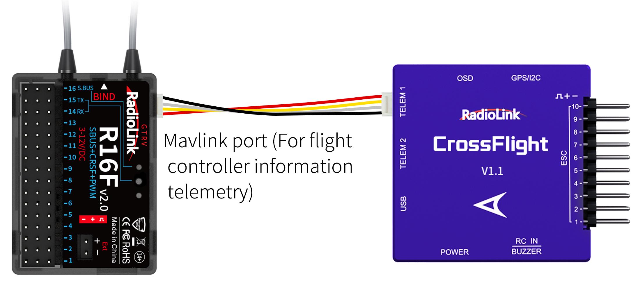 When T16D works with a flight control and a GPS, connect the Mavlink port of R16F to the TELEM port of the flight control. Take TELEM1 as en example (R16F comes with the below connect cable):