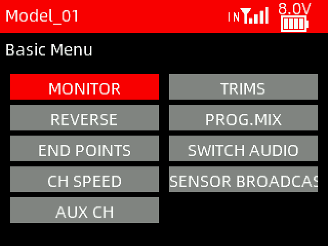After powering on T16D, press End button once on the home interface to quickly view the MONITOR, and press it twice to the flight controller telemetry(See picture below).