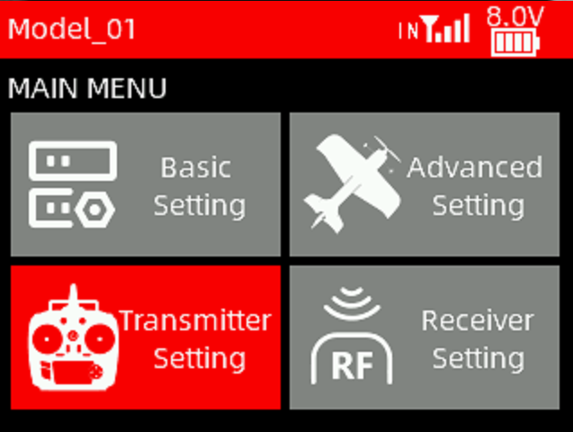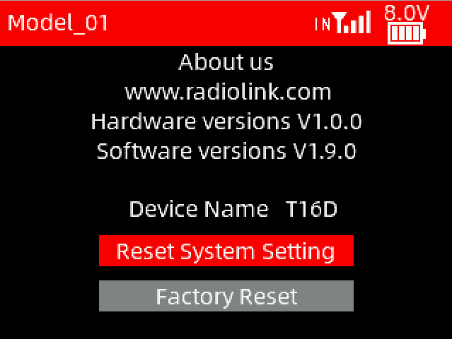 >Long press the power button to use the transmitter normally. You can check the current firmware version in Transmitter Settings--ABOUT menu interface to confirm that the firmware upgrade is successful.