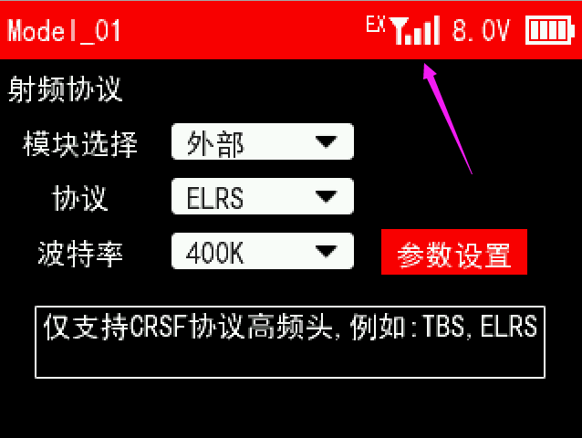 After the binding is successful, the short line “-” in the upper right corner will change to "C". Return and you can see the signal tower on the top, and the LED of the ELRS receiver is always on.