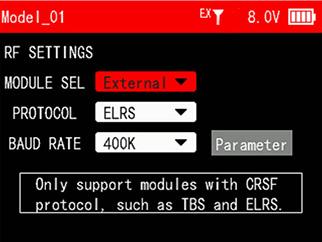 When the transmitter is connected to an external module, select external in "Module Selection". After selecting external, EX will be displayed next to the signal tower on the taskbar. At this time, setting parameters of the external module will appear on the current interface, such as PROTOCOL, BAUD and RATE.